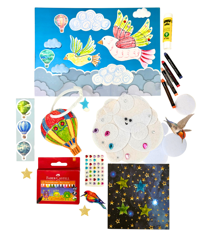 A creative journey through the clouds with the magical birds to find the lost cloud island designed for little explorers (even while traveling) Light weight-No liquids- plane Safe.
