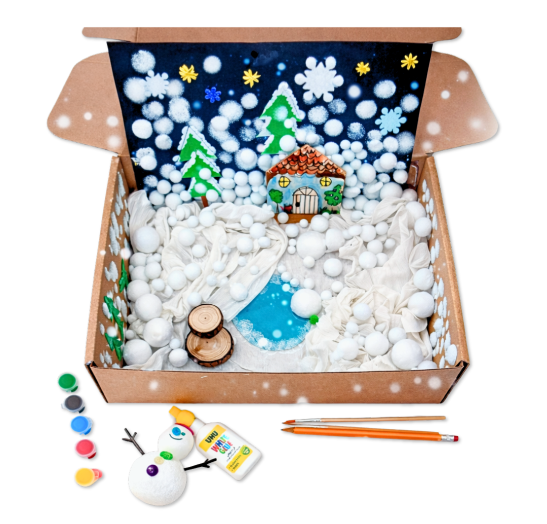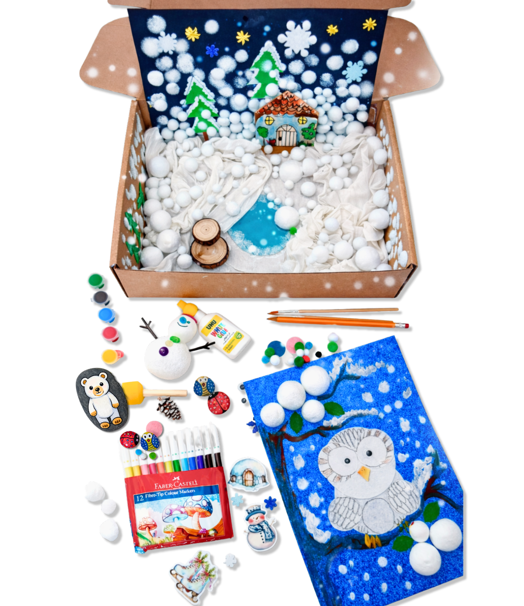 We love stone art, it lasts for ever. after they finish their scene they can draw with the black pen the snow bear and owl then paint them, then place them in the art box winter scene and play adventure.